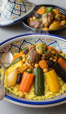 Een rijk en kruidig gerecht met langzaam gegaarde lamsschenkels, pittige merguez en een mix van groenten zoals wortel, courgette en paprika. Geserveerd met couscous en rozijnen voor een heerlijke balans tussen hartig en licht zoet.