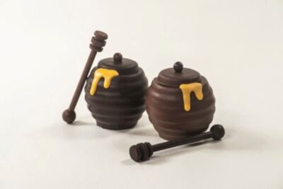 Ambachtelijke honingpotjes. Schattige gevulde chocolade honingpotjes met een honinglepeltje, een bijtje en een stukje gele chocolade honingraat.