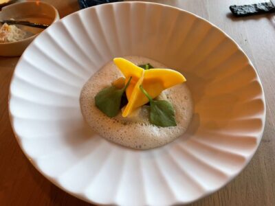 Bij de huischampagne serveerde Baptiste een selectie leuke amuses, een betoverende marinade van rode biet met Oosterschelde paling en creme, pittig en aantrekkelijk ziltig; een tartaar van makreel met ago blanco, een Spaanse soep op basis van look en amandelen, en ingelegd druif; gepekelde zeebaars met beurre noissette en limoenkoffie en een tempura van zeekat met ponzu en sesam. Van een krachtige en overweldigende introductie gesproken.