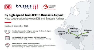 Vanaf september 2026 zal een hogesnelheidstrein van Deutsche Bahn Brussels Airport met Keulen verbinden. De rit duurt een tweetal uur en geeft reizigers uit Duitsland de mogelijkheid om over te stappen op de meer dan 180 bestemmingen uit het netwerk van Brussels Airport. Brussels Airlines lanceert een codeshare met Deutsche Bahn, waardoor de treinrit ook een vluchtnummer van Brussels Airlines zal hebben. Passagiers zullen dankzij deze samenwerking naadloze connecties aangeboden krijgen op Brussels Airport. Tickets zijn vanaf vandaag te koop.