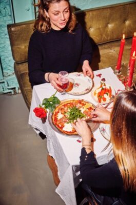 Valentijn bij Otomat draait om samen genieten: Glas cava bij aankomst, Apero bite to share: rillettes, hummus of labneh; Sharing menu met drie kleinere pizza’s, twee sides en een dip om te delen; Dessert to share: tiramisu, crème brulée of Otomat snickers