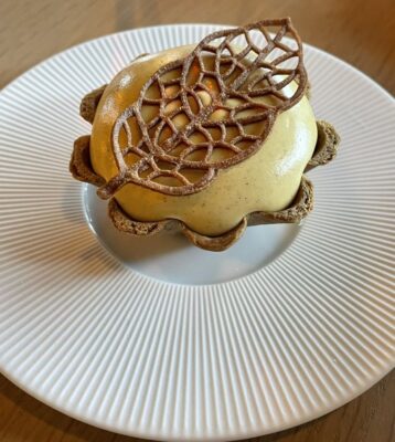 Ook het hoofdgerecht werd een absolute topper. Kraakwitte kabeljauw met heerlijk dekseltje en pittige toetsen van de consomé mooi aangevuld met een eigen creatie van eekhoorntjesbrood. Een smaakvolle culinaire benadering met respect voor de eigenheid van alle ingrediënten. Meer dan een lust voor de jubelende smaakpapillen met lang uitlopende smaaktoetsen.