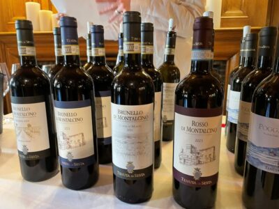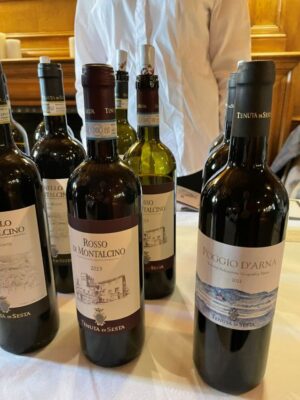 Van pure Sangiovese komen de grote wijnen van Montalcino: Brunello di Montalcino D.O.C.G., Brunello Riserva D.O.C.G., alleen geproduceerd tijdens de beste oogstjaren uit de selectie van de beste Brunello-druiven, en Rosso di Montalcino D.O.C. Uit de vermenging van Sangiovese Grosso met andere variëteiten ontstaan twee rode I.G.T.-wijnen van het landgoed: Camponovo, een jonge en frisse wijn waarvoor Sangiovese wordt vermengd met een andere typische variëteit uit de Toscaanse regio, Colorino; Poggio d’Arna met zijn meer internationale smaak, die Sangiovese verrijkt in kleur en aroma door Merlot en Cabernet Franc.